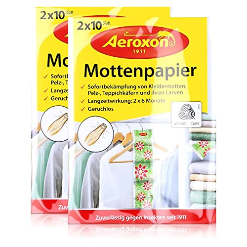 - Hochwirksamer Mottenschutz für Kleidung: Das Aeroxon Mottenpapier bietet bis zu 3 Monate Schutz gegen Kleidermotten. Die mit Lavendelöl getränkten Streifen wirken schnell und effektiv gegen Motten und verhindern zuverlässig einen Neubefall. Schützt Textilien wie Wolle, Kaschmir und Seide.